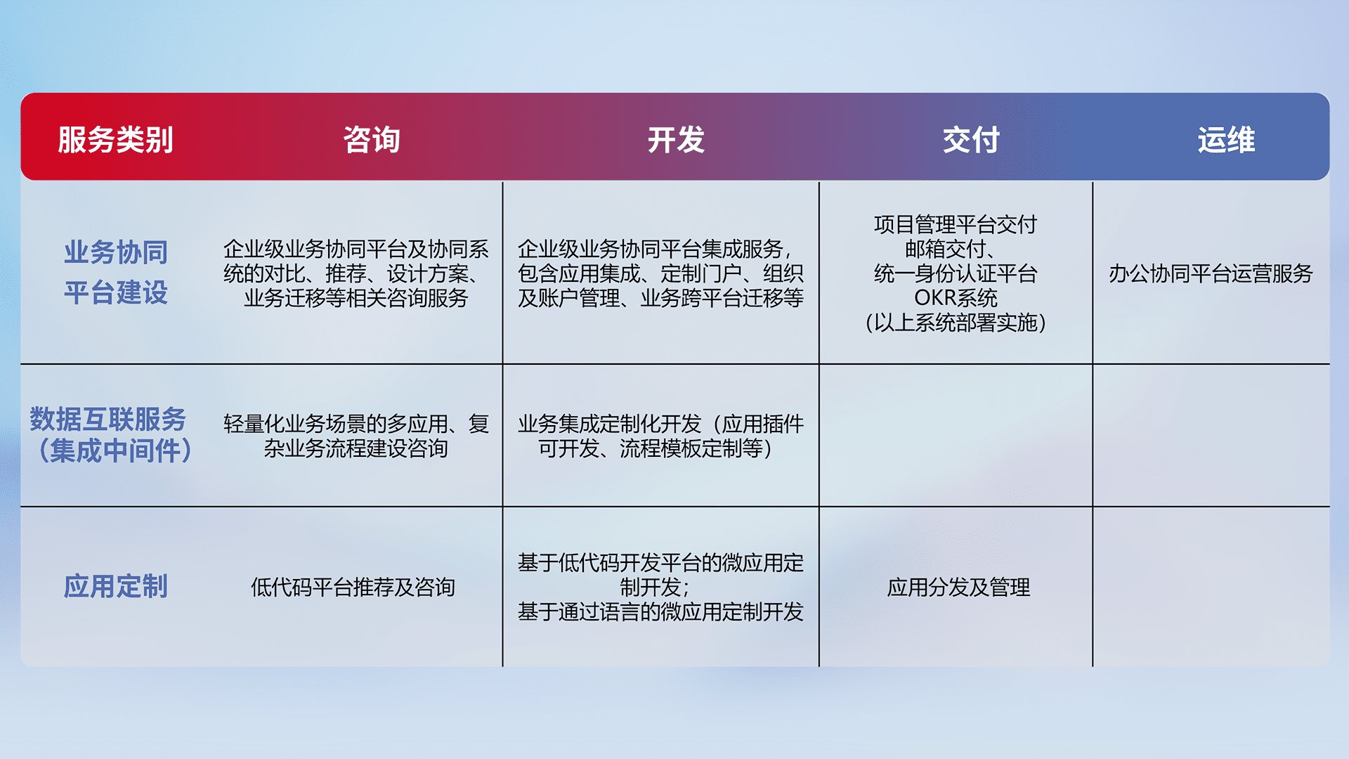针对钉钉、、企微、、、IDaas等平台级产品提供产品的规划、、、方案、、交付、、定制化开发等服务,,,实现如统一协同办公、、智能客户服务、、、、混合会议管理、、智能数据查询、、、等业务场景,,实现数字化转型。。。。