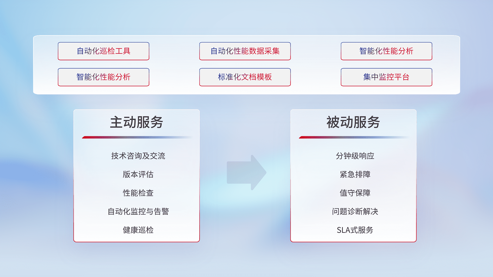智能化工具和标准化文档,,,,保障服务质量,,提供主动服务(包含技术咨询、、版本评估、、性能检查、、、自动化监控与告警、、、、健康巡检)和被动服务包含(分钟级响应、、、紧急排障、、、、值守保障、、、问题诊断解决、、、、SLA服务)。。。。